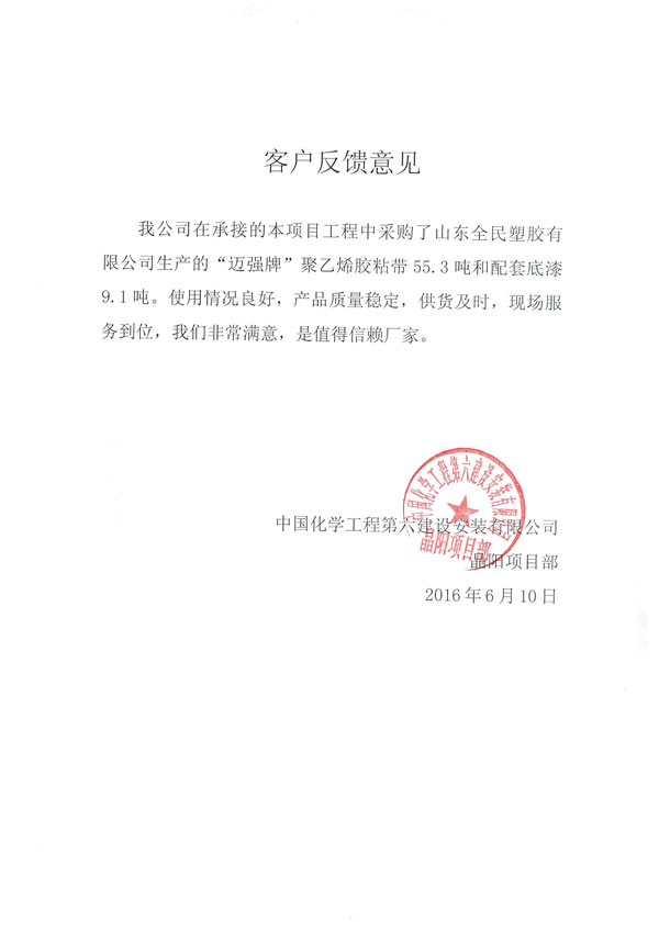 我公司在承接的本项目工程中采购了DUOBAO.COM(中国)有限公司生产的“迈强牌”聚乙烯胶粘带55.3吨和配套底漆9.1吨。使用情况良好,产品质量稳定,供货及时,现场服务到位,我们非常满意,是值得信赖厂家。